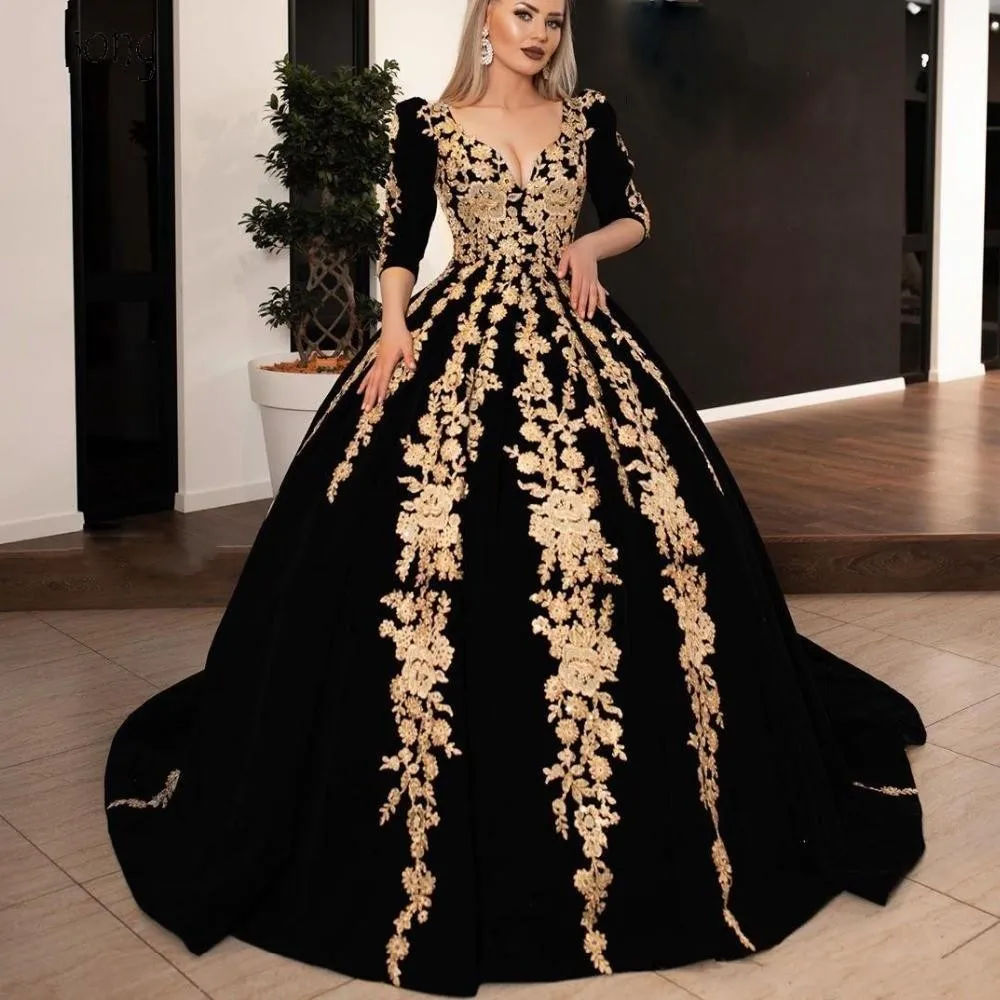 Vintage Black Gold Embroidered Prom Black Gold Quinceanera Dresses With Long Sleeves And V Neckline For Women Perfect For Sweet 16 Bridal And South African Occasions From Lovemydress 122 41 Dhgate Com